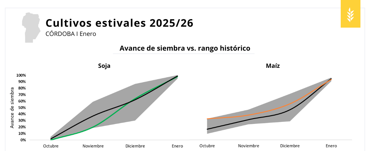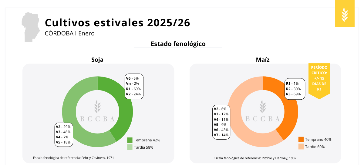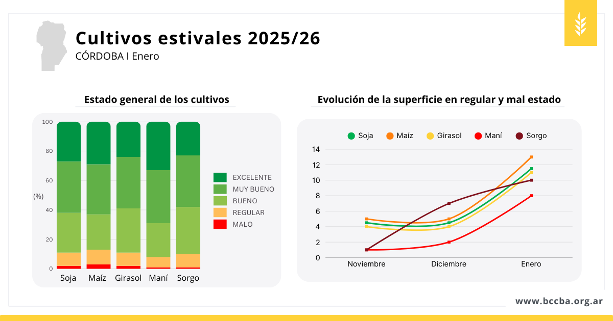 La campaña estival en la zona relevada muestra, en términos generales, un estado de los cultivos muy bueno, aunque con una creciente heterogeneidad entre regiones y fechas de siembra. El inicio del ciclo fue favorable, con buenas condiciones de implantación y perfiles que, en muchos casos, comenzaron con reservas adecuadas. Sin embargo, hacia fines de diciembre y comienzos de enero se intensificaron las altas temperaturas y la falta de precipitaciones, generando señales de estrés hídrico y térmico, especialmente en los cultivos que transitan o ingresan a su período crítico.
