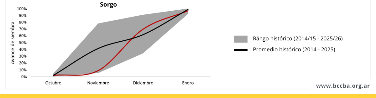 Las siembras están finalizadas, los cultivos emergidos y en muy buen estado general. No obstante, las altas temperaturas generalizadas y la falta de precipitaciones registradas hacia fines de diciembre, principalmente en el sur, comenzaron a generar situaciones de estrés hídrico y térmico, sobre todo en los cultivos más tempranos. En este contexto, se realizó la primera estimación de girasol, con una producción que se ubicaría por encima del promedio histórico, impulsada por una mayor superficie sembrada.