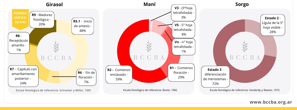 En el cultivo de girasol, aproximadamente la mitad de la superficie relevada se encontraba transitando el período crítico, mientras que el resto ya lo había superado, con una fracción del área que ya había sido cosechada.