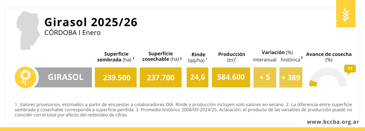 Durante las primeras semanas de enero, la cosecha de girasol llevaba un avance elevado para la época, explicado por un mayor porcentaje de superficie sembrada de manera temprana. En esta primera estimación, los rindes resultan superiores al promedio histórico, aunque inferiores a los obtenidos en la campaña pasada. En cuanto a la producción esperada, se estima un volumen superior en más de un 300% respecto del histórico provincial, impulsado principalmente por el aumento de la superficie sembrada en la presente campaña.