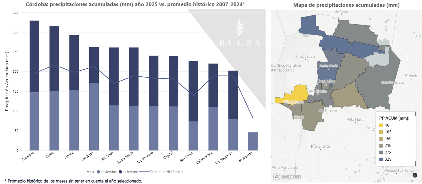 Durante el mes de diciembre, las precipitaciones se distribuyeron de manera muy dispar entre zonas. Mientras que en los departamentos del norte los acumulados superaron los valores promedio, en la zona sur resultaron insuficientes, provocando estrés hídrico, especialmente en los cultivos de siembra temprana.
