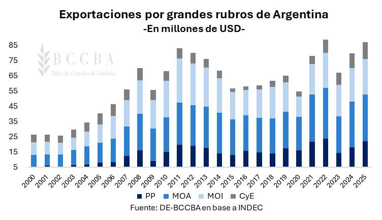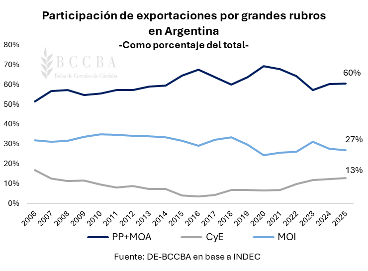 Si se considera la participación del sector agroindustrial en su conjunto a través del rubro PP+MOA, se observa que en 2025 explicó el 60% del total de divisas generadas por el país. Esto demuestra el sostenido rol predominante con el que cuenta el sector a lo largo de los años en la generación de ingresos para la economía nacional.