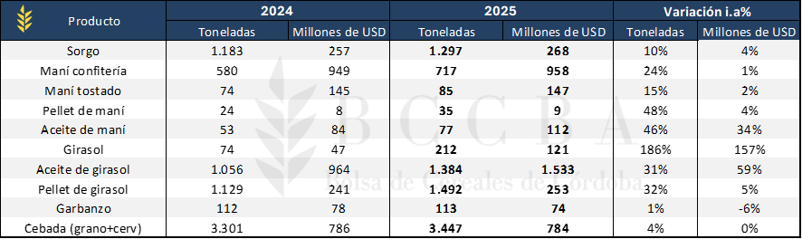Entre los productos que más crecieron se destacan los incrementos por parte del complejo girasolero, en el cual la semilla aumentó 157% sus ventas alcanzando los USD 121 millones y el aceite un 59% alcanzando ingresos por USD 1.533 millones. También, se destacó el rol del complejo manisero, con un aumento del 34% en el aceite de maní reflejando un ingreso de USD 112 millones.