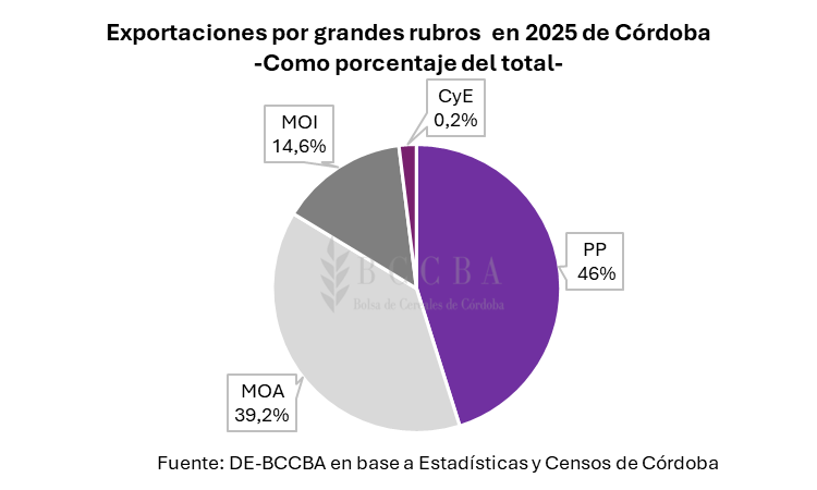 Las ventas al exterior por parte de Córdoba se ubicaron en USD 10.900 millones, ubicándose 7% por encima del 2024. En cuanto a las categorías por grandes rubros, el 46% de los ingresos a nivel provincial provinieron de los productos primarios (PP), que se ubicaron en USD 5.000 millones, con el 39,2% de la participación las manufacturas de origen agropecuario (MOA) materializaron los USD 4.300 millones, con el 14,6% participaron las manufacturas de origen industrial (MOI) y con una incidencia mínima del 0,2% el rubro de Combustibles y Energías (CyE).
