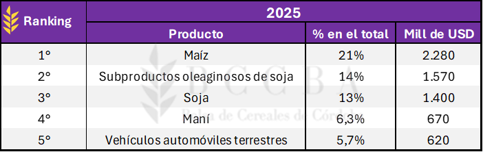 Los cinco productos más exportados por la provincia representaron el 60% de sus respectivas ventas al exterior en 2025. En primer lugar, se ubicó el maíz con el 21% de la participación totalizando un ingreso de USD 2.280 millones. Le siguieron los subproductos de oleaginosas con el 14% que generaron USD 1.570 millones, luego se posicionó la soja con el 13% con un ingreso de USD 1.400 millones. En cuarto lugar, se ubicó el maní que representó ventas por USD 670 millones con el 6,3% y en último lugar, las ventas de vehículos automóviles terrestres con el 5,7% y un ingreso del USD 620 millones. Mientras que, el 40% restante se corresponde con una amplitud de productos con una incidencia menor en el total.